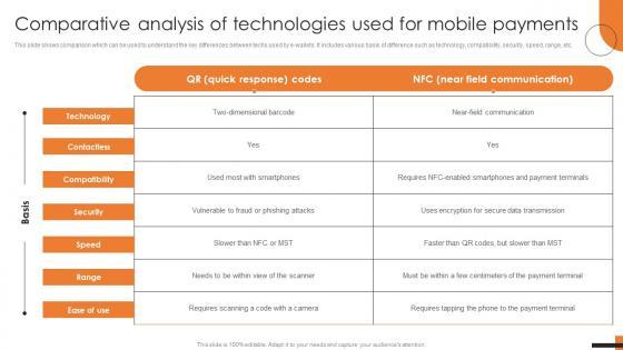 This slide shows comparison which can be used to understand the key differences between techs used by e-wallets. It includes various basis of difference such as technology, compatibility, security, speed, range, etc.Slidegeeks is here to make your presentations a breeze with Comparative Analysis Of Technologies Used Comprehensive Smartphone Banking Pictures Pdf With our easy-to-use and customizable templates, you can focus on delivering your ideas rather than worrying about formatting. With a variety of designs to choose from, you are sure to find one that suits your needs. And with animations and unique photos, illustrations, and fonts, you can make your presentation pop. So whether you are giving a sales pitch or presenting to the board, make sure to check out Slidegeeks first. This slide shows comparison which can be used to understand the key differences between techs used by e wallets. It includes various basis of difference such as technology, compatibility, security, speed, range, etc.