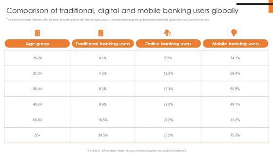 This slide shows data related to different types of banking users with different age groups. It includes percentage of population uses traditional, digital and mobile banking services. Do you have an important presentation coming up Are you looking for something that will make your presentation stand out from the rest Look no further than Comparison Of Traditional Digital And Mobile Comprehensive Smartphone Banking Microsoft Pdf. With our professional designs, you can trust that your presentation will pop and make delivering it a smooth process. And with Slidegeeks, you can trust that your presentation will be unique and memorable. So why wait Grab Comparison Of Traditional Digital And Mobile Comprehensive Smartphone Banking Microsoft Pdf today and make your presentation stand out from the rest. This slide shows data related to different types of banking users with different age groups. It includes percentage of population uses traditional, digital and mobile banking services.