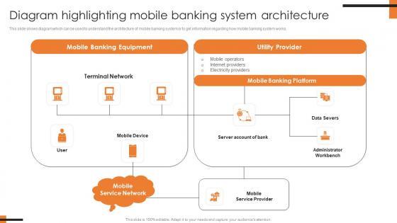 This slide shows diagram which can be used to understand the architecture of mobile banking system or to get information regarding how mobile banking system works. If you are looking for a format to display your unique thoughts, then the professionally designed Diagram Highlighting Mobile Banking Comprehensive Smartphone Banking Diagrams Pdf is the one for you. You can use it as a Google Slides template or a PowerPoint template. Incorporate impressive visuals, symbols, images, and other charts. Modify or reorganize the text boxes as you desire. Experiment with shade schemes and font pairings. Alter, share or cooperate with other people on your work. Download Diagram Highlighting Mobile Banking Comprehensive Smartphone Banking Diagrams Pdf and find out how to give a successful presentation. Present a perfect display to your team and make your presentation unforgettable. This slide shows diagram which can be used to understand the architecture of mobile banking system or to get information regarding how mobile banking system works.
