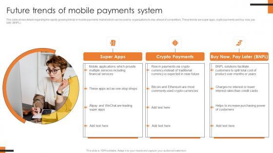 This slide shows details regarding the rapidly growing trends in mobile payments market which can be used by organizations to stay ahead of competitors. These trends are super apps, crypto payments and buy now, pay later BNPL. This Future Trends Of Mobile Payments System Comprehensive Smartphone Banking Diagrams Pdf is perfect for any presentation, be it in front of clients or colleagues. It is a versatile and stylish solution for organizing your meetings. The Future Trends Of Mobile Payments System Comprehensive Smartphone Banking Diagrams Pdf features a modern design for your presentation meetings. The adjustable and customizable slides provide unlimited possibilities for acing up your presentation. Slidegeeks has done all the homework before launching the product for you. So, do not wait, grab the presentation templates today This slide shows details regarding the rapidly growing trends in mobile payments market which can be used by organizations to stay ahead of competitors. These trends are super apps, crypto payments and buy now, pay later BNPL.