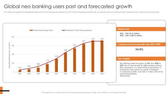 This slide shows graph which highlights the total number of neo banking users globally from 2017 to 2026 along with penetration rate, according to which neo banking market is expected to grow continuously in coming years. Welcome to our selection of the Global Neo Banking Users Past And Forecasted Comprehensive Smartphone Banking Slides Pdf. These are designed to help you showcase your creativity and bring your sphere to life. Planning and Innovation are essential for any business that is just starting out. This collection contains the designs that you need for your everyday presentations. All of our PowerPoints are 100Precent editable, so you can customize them to suit your needs. This multi-purpose template can be used in various situations. Grab these presentation templates today. This slide shows graph which highlights the total number of neo banking users globally from 2017 to 2026 along with penetration rate, according to which neo banking market is expected to grow continuously in coming years.