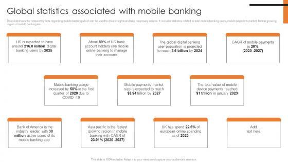 This slideshows the noteworthy facts regarding mobile banking which can be used to drive insights and take necessary actions. It includes statistics related to total mobile banking users, mobile payments market, fastest growing region of mobile banking etc. Explore a selection of the finest Global Statistics Associated With Mobile Banking Comprehensive Smartphone Banking Formats Pdf here. With a plethora of professionally designed and pre-made slide templates, you can quickly and easily find the right one for your upcoming presentation. You can use our Global Statistics Associated With Mobile Banking Comprehensive Smartphone Banking Formats Pdf to effectively convey your message to a wider audience. Slidegeeks has done a lot of research before preparing these presentation templates. The content can be personalized and the slides are highly editable. Grab templates today from Slidegeeks. This slideshows the noteworthy facts regarding mobile banking which can be used to drive insights and take necessary actions. It includes statistics related to total mobile banking users, mobile payments market, fastest growing region of mobile banking etc.