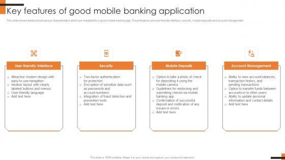 This slide shows details about various characteristics which are important for a good mobile banking app. These features are user friendly interface, security, mobile deposits and account managementThis Key Features Of Good Mobile Banking Application Comprehensive Smartphone Banking Mockup Pdf from Slidegeeks makes it easy to present information on your topic with precision. It provides customization options, so you can make changes to the colors, design, graphics, or any other component to create a unique layout. It is also available for immediate download, so you can begin using it right away. Slidegeeks has done good research to ensure that you have everything you need to make your presentation stand out. Make a name out there for a brilliant performance. This slide shows details about various characteristics which are important for a good mobile banking app. These features are user friendly interface, security, mobile deposits and account management