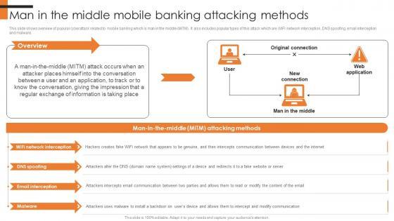 This slide shows overview of popular cyberattack related to mobile banking which is man in the middle MiTM. It also includes popular types of this attack which are WIFI network interception, DNS spoofing, email interceptio and malware.Find a pre-designed and impeccable Man In The Middle Mobile Banking Attacking Comprehensive Smartphone Banking Mockup Pdf. The templates can ace your presentation without additional effort. You can download these easy-to-edit presentation templates to make your presentation stand out from others. So, what are you waiting for Download the template from Slidegeeks today and give a unique touch to your presentation. This slide shows overview of popular cyberattack related to mobile banking which is man in the middle MiTM . It also includes popular types of this attack which are WIFI network interception, DNS spoofing, email interception and malware.