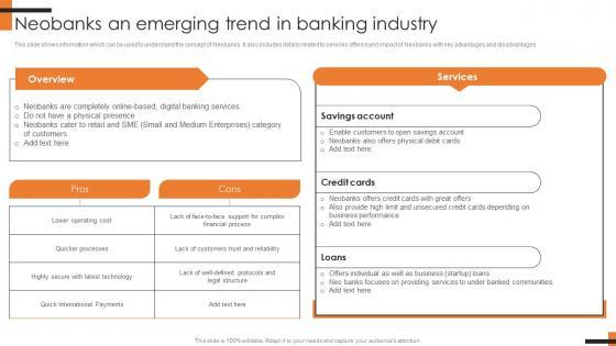 This slide shows information which can be used to understand the concept of Neobanks. It also includes details related to services offered and impact of Neobanks with key advantages and disadvantages. From laying roadmaps to briefing everything in detail, our templates are perfect for you. You can set the stage with your presentation slides. All you have to do is download these easy-to-edit and customizable templates. Neobanks An Emerging Trend In Banking Industry Comprehensive Smartphone Banking Rules Pdf will help you deliver an outstanding performance that everyone would remember and praise you for. Do download this presentation today. This slide shows information which can be used to understand the concept of Neobanks. It also includes details related to services offered and impact of Neobanks with key advantages and disadvantages.