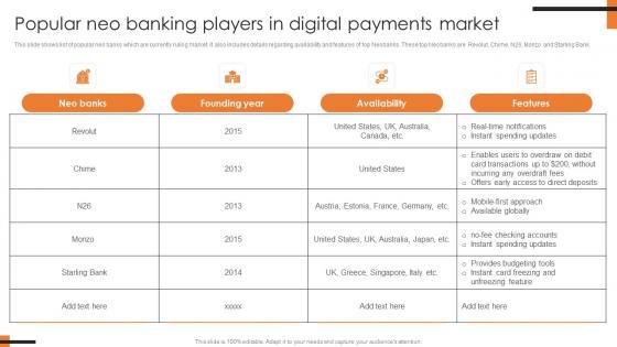 This slide shows list of popular neo banks which are currently ruling market. It also includes details regarding availability and features of top Neobanks. These top Neobanks are Revolut, Chime, N26, Monzo and Starling Bank. Find highly impressive Popular Neo Banking Players In Digital Comprehensive Smartphone Banking Infographics Pdf on Slidegeeks to deliver a meaningful presentation. You can save an ample amount of time using these presentation templates. No need to worry to prepare everything from scratch because Slidegeeks experts have already done a huge research and work for you. You need to download Popular Neo Banking Players In Digital Comprehensive Smartphone Banking Infographics Pdf for your upcoming presentation. All the presentation templates are 100Precent editable and you can change the color and personalize the content accordingly. Download now. This slide shows list of popular neo banks which are currently ruling market. It also includes details regarding availability and features of top Neobanks. These top Neobanks are Revolut, Chime, N26, Monzo and Starling Bank.