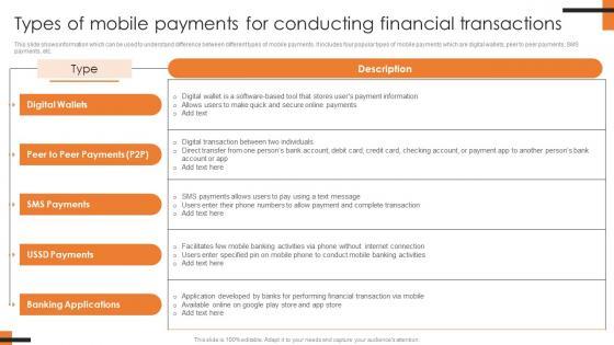 This slide shows information which can be used to understand difference between different types of mobile payments. It includes four popular types of mobile payments which are digital wallets, peer to peer payments, SMS payments, etc.Retrieve professionally designed Types Of Mobile Payments For Conducting Comprehensive Smartphone Banking Structure Pdf to effectively convey your message and captivate your listeners. Save time by selecting pre-made slideshows that are appropriate for various topics, from business to educational purposes. These themes come in many different styles, from creative to corporate, and all of them are easily adjustable and can be edited quickly. Access them as PowerPoint templates or as Google Slides themes. You do not have to go on a hunt for the perfect presentation because Slidegeeks got you covered from everywhere. This slide shows information which can be used to understand difference between different types of mobile payments. It includes four popular types of mobile payments which are digital wallets, peer to peer payments, SMS payments, etc.