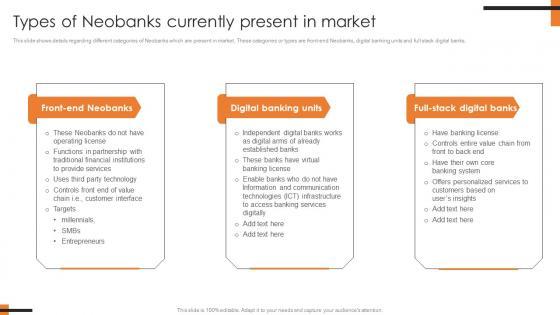 This slide shows details regarding different categories of Neobanks which are present in market. These categories or types are front-end Neobanks, digital banking units and full stack digital banks. Slidegeeks has constructed Types Of Neobanks Currently Present In Market Comprehensive Smartphone Banking Elements Pdf after conducting extensive research and examination. These presentation templates are constantly being generated and modified based on user preferences and critiques from editors. Here, you will find the most attractive templates for a range of purposes while taking into account ratings and remarks from users regarding the content. This is an excellent jumping-off point to explore our content and will give new users an insight into our top-notch PowerPoint Templates. This slide shows details regarding different categories of Neobanks which are present in market. These categories or types are front end Neobanks, digital banking units and full stack digital banks.