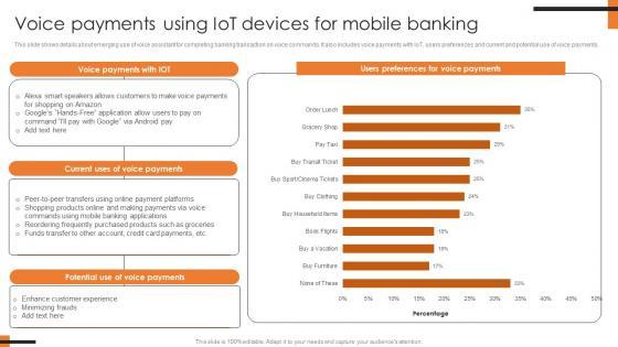 This slide shows details about emerging use of voice assistant for completing banking transaction on voice commands. It also includes voice payments with IoT, users preferences and current and potential use of voice payments. Do you know about Slidesgeeks Voice Payments Using Iot Devices For Mobile Comprehensive Smartphone Banking Brochure Pdf These are perfect for delivering any kind od presentation. Using it, create PowerPoint presentations that communicate your ideas and engage audiences. Save time and effort by using our pre-designed presentation templates that are perfect for a wide range of topic. Our vast selection of designs covers a range of styles, from creative to business, and are all highly customizable and easy to edit. Download as a PowerPoint template or use them as Google Slides themes. This slide shows details about emerging use of voice assistant for completing banking transaction on voice commands. It also includes voice payments with IoT, users preferences and current and potential use of voice payments.