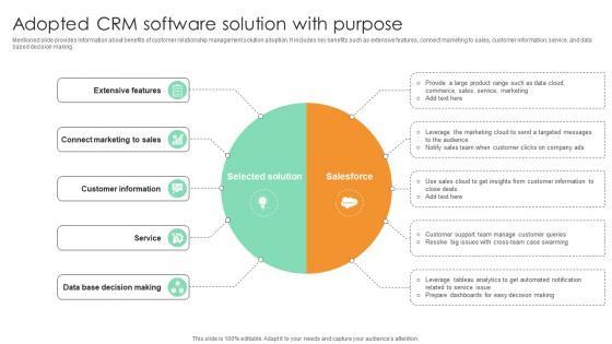 Mentioned slide provides information about benefits of customer relationship management solution adoption. It includes key benefits such as extensive features, connect marketing to sales, customer information, service, and data based decision making.Find a pre-designed and impeccable Adopted CRM Software Solution With Purpose Comprehensive Guide For Marketing Technology. The templates can ace your presentation without additional effort. You can download these easy-to-edit presentation templates to make your presentation stand out from others. So, what are you waiting for Download the template from Slidegeeks today and give a unique touch to your presentation. Mentioned slide provides information about benefits of customer relationship management solution adoption. It includes key benefits such as extensive features, connect marketing to sales, customer information, service, and data based decision making.