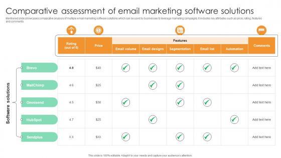Mentioned slide showcases comparative analysis of multiple email marketing software solutions which can be used by businesses to leverage marketing campaigns. It includes key attributes such as price, rating, features and comments.If you are looking for a format to display your unique thoughts, then the professionally designed Comparative Assessment Of Email Marketing Software Comprehensive Guide For Marketing Technology is the one for you. You can use it as a Google Slides template or a PowerPoint template. Incorporate impressive visuals, symbols, images, and other charts. Modify or reorganize the text boxes as you desire. Experiment with shade schemes and font pairings. Alter, share or cooperate with other people on your work. Download Comparative Assessment Of Email Marketing Software Comprehensive Guide For Marketing Technology and find out how to give a successful presentation. Present a perfect display to your team and make your presentation unforgettable. Mentioned slide showcases comparative analysis of multiple email marketing software solutions which can be used by businesses to leverage marketing campaigns. It includes key attributes such as price, rating, features and comments.