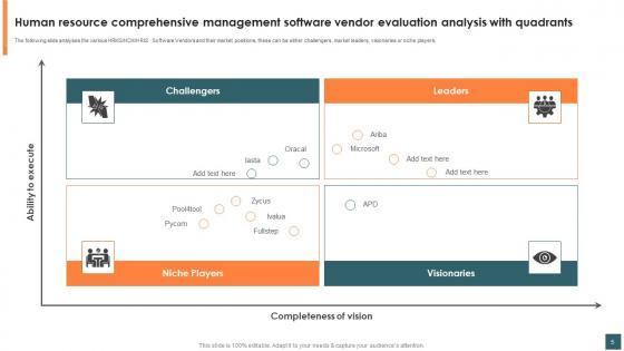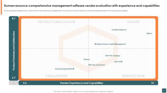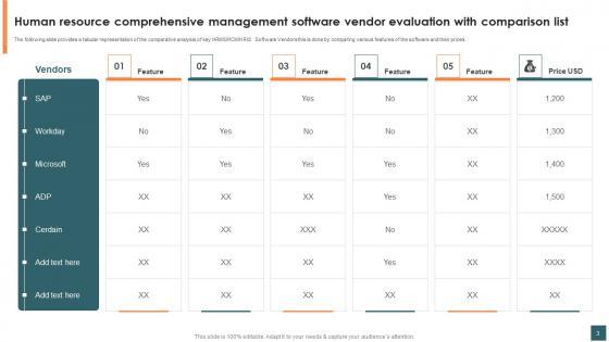 This Human Resource Comprehensive Management Software Vendor Evaluation Ppt Powerpoint Presentation Complete Deck is designed to help you retain your audiences attention. This content-ready PowerPoint Template enables you to take your audience on a journey and share information in a way that is easier to recall. It helps you highlight the crucial parts of your work so that the audience does not get saddled with information download. This sixteen slide PPT Deck comes prepared with the graphs and charts you could need to showcase your information through visuals. You only need to enter your own data in them. Download this editable PowerPoint Theme and walk into that meeting with confidence. Our Human Resource Comprehensive Management Software Vendor Evaluation Ppt Powerpoint Presentation Complete Deck are topically designed to provide an attractive backdrop to any subject. Use them to look like a presentation pro.