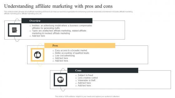 This slide provides glimpse about affiliate marketing and how it can help our business organization for enhancing customer awareness and interest. It includes affiliate marketing, affiliate marketing pros, affiliate marketing cons, etc. Find a pre designed and impeccable Understanding Affiliate Marketing Comprehensive Guide For Paid Media Marketing Strategies Template Pdf. The templates can ace your presentation without additional effort. You can download these easy to edit presentation templates to make your presentation stand out from others. So, what are you waiting for Download the template from Slidegeeks today and give a unique touch to your presentation. This slide provides glimpse about affiliate marketing and how it can help our business organization for enhancing customer awareness and interest. It includes affiliate marketing, affiliate marketing pros, affiliate marketing cons, etc.