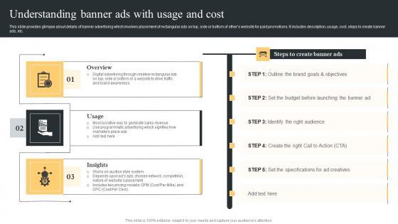 This slide provides glimpse about details of banner advertising which involves placement of rectangular ads on top, side or bottom of others website for paid promotions. It includes description, usage, cost, steps to create banner ads, etc. Boost your pitch with our creative Understanding Banner Ads Comprehensive Guide For Paid Media Marketing Strategies Pictures Pdf. Deliver an awe inspiring pitch that will mesmerize everyone. Using these presentation templates you will surely catch everyones attention. You can browse the ppts collection on our website. We have researchers who are experts at creating the right content for the templates. So you do not have to invest time in any additional work. Just grab the template now and use them. This slide provides glimpse about details of banner advertising which involves placement of rectangular ads on top, side or bottom of others website for paid promotions. It includes description, usage, cost, steps to create banner ads, etc.