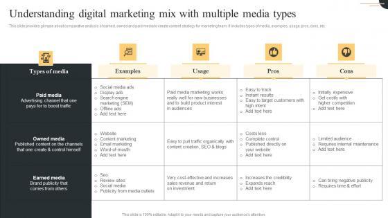 This slide provides glimpse about comparative analysis of earned, owned and paid media to create content strategy for marketing team. It includes types of media, examples, usage, pros, cons, etc. Create an editable Understanding Digital Marketing Comprehensive Guide For Paid Media Marketing Strategies Background Pdf that communicates your idea and engages your audience. Whether you are presenting a business or an educational presentation, pre designed presentation templates help save time. Understanding Digital Marketing Comprehensive Guide For Paid Media Marketing Strategies Background Pdf is highly customizable and very easy to edit, covering many different styles from creative to business presentations. Slidegeeks has creative team members who have crafted amazing templates. So, go and get them without any delay. This slide provides glimpse about comparative analysis of earned, owned and paid media to create content strategy for marketing team. It includes types of media, examples, usage, pros, cons, etc.