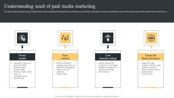 This slide provides glimpse about top benefits of paid media marketing that distinguish it from other types and methods of marketing. It includes characteristics such as faster results, easy control, target the ideal customers, etc. Want to ace your presentation in front of a live audience Our Understanding Need Of Paid Comprehensive Guide For Paid Media Marketing Strategies Ideas Pdf can help you do that by engaging all the users towards you. Slidegeeks experts have put their efforts and expertise into creating these impeccable powerpoint presentations so that you can communicate your ideas clearly. Moreover, all the templates are customizable, and easy to edit and downloadable. Use these for both personal and commercial use. This slide provides glimpse about top benefits of paid media marketing that distinguish it from other types and methods of marketing. It includes characteristics such as faster results, easy control, target the ideal customers, etc.