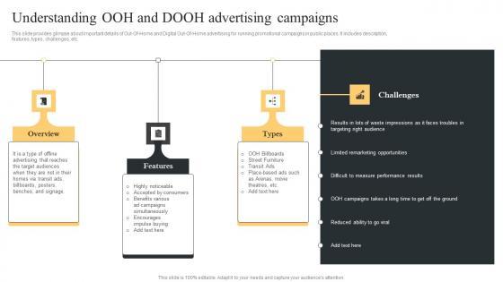 This slide provides glimpse about important details of Out Of Home and Digital Out Of Home advertising for running promotional campaigns in public places. It includes description, features, types, challenges, etc. There are so many reasons you need a Understanding OOH And DOOH Comprehensive Guide For Paid Media Marketing Strategies Clipart Pdf. The first reason is you can not spend time making everything from scratch, Thus, Slidegeeks has made presentation templates for you too. You can easily download these templates from our website easily. This slide provides glimpse about important details of Out Of Home and Digital Out Of Home advertising for running promotional campaigns in public places. It includes description, features, types, challenges, etc.