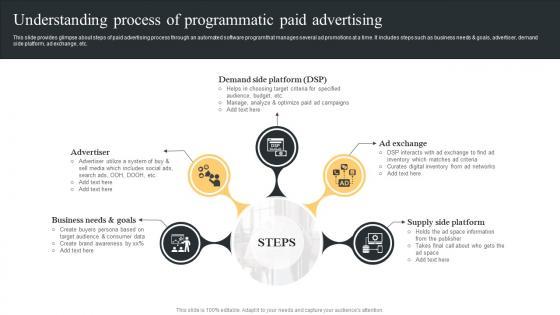 This slide provides glimpse about steps of paid advertising process through an automated software program that manages several ad promotions at a time. It includes steps such as business needs and goals, advertiser, demand side platform, ad exchange, etc. Get a simple yet stunning designed Understanding Process Programmatic Comprehensive Guide Paid Media Marketing Strategies Ideas Pdf. It is the best one to establish the tone in your meetings. It is an excellent way to make your presentations highly effective. So, download this PPT today from Slidegeeks and see the positive impacts. Our easy to edit Understanding Process Programmatic Comprehensive Guide Paid Media Marketing Strategies Ideas Pdf can be your go to option for all upcoming conferences and meetings. So, what are you waiting for Grab this template today. This slide provides glimpse about steps of paid advertising process through an automated software program that manages several ad promotions at a time. It includes steps such as business needs and goals, advertiser, demand side platform, ad exchange, etc.