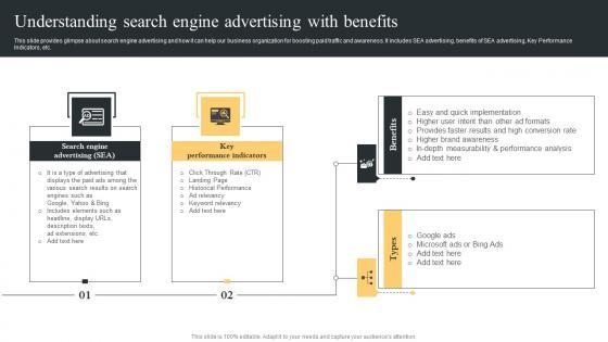 This slide provides glimpse about search engine advertising and how it can help our business organization for boosting paid traffic and awareness. It includes SEA advertising, benefits of SEA advertising, Key Performance Indicators, etc. From laying roadmaps to briefing everything in detail, our templates are perfect for you. You can set the stage with your presentation slides. All you have to do is download these easy to edit and customizable templates. Understanding Search Engine Comprehensive Guide For Paid Media Marketing Strategies Mockup Pdf will help you deliver an outstanding performance that everyone would remember and praise you for. Do download this presentation today. This slide provides glimpse about search engine advertising and how it can help our business organization for boosting paid traffic and awareness. It includes SEA advertising, benefits of SEA advertising, Key Performance Indicators, etc.