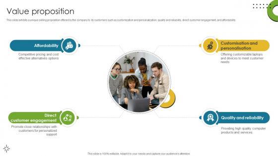 This slide exhibits a unique selling proposition offered by the company to its customers such as customization and personalization, quality and reliability, direct customer engagement, and affordability. Are you in need of a template that can accommodate all of your creative concepts This one is crafted professionally and can be altered to fit any style. Use it with Google Slides or PowerPoint. Include striking photographs, symbols, depictions, and other visuals. Fill, move around, or remove text boxes as desired. Test out color palettes and font mixtures. Edit and save your work, or work with colleagues. Download Value Proposition Direct To Consumer Computer Manufacturing Business Model BMC SS V and observe how to make your presentation outstanding. Give an impeccable presentation to your group and make your presentation unforgettable. This slide exhibits a unique selling proposition offered by the company to its customers such as customization and personalization, quality and reliability, direct customer engagement, and affordability.