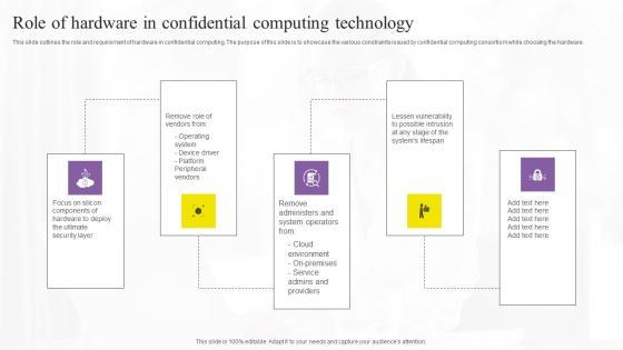 This slide outlines the role and requirement of hardware in confidential computing. The purpose of this slide is to showcase the various constraints issued by confidential computing consortium while choosing the hardware. If your project calls for a presentation, then Slidegeeks is your go-to partner because we have professionally designed, easy-to-edit templates that are perfect for any presentation. After downloading, you can easily edit Confidential Computing System Technology Role Of Hardware In Confidential Computing Infographics PDF and make the changes accordingly. You can rearrange slides or fill them with different images. Check out all the handy templates