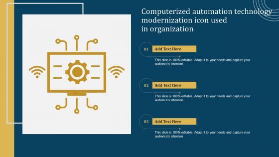 Showcasing this set of slides titled Computerized Automation Technology Modernization Icon Used In Organization Summary Pdf The topics addressed in these templates are Computerized Automation, Technology Modernization Icon, Organization All the content presented in this PPT design is completely editable. Download it and make adjustments in color, background, font etc. as per your unique business setting. Our Computerized Automation Technology Modernization Icon Used In Organization Summary Pdf are topically designed to provide an attractive backdrop to any subject. Use them to look like a presentation pro.