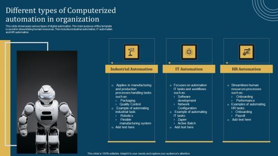 This slide showcases various types of digital automation. The main purpose of this template is assist in streamlining human resources. This includes industrial automation, IT automation and HR automation. Pitch your topic with ease and precision using this Different Types Of Computerized Automation In Organization Background Pdf This layout presents information on Industrial Automation, Hr Automation, Streamlines Human It is also available for immediate download and adjustment. So, changes can be made in the color, design, graphics or any other component to create a unique layout. This slide showcases various types of digital automation. The main purpose of this template is assist in streamlining human resources. This includes industrial automation, IT automation and HR automation.