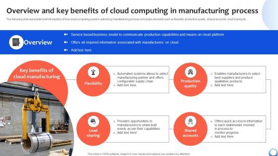 The following slide represents brief introduction of how cloud computing assist in optimizing manufacturing process. It includes elements such as flexibility, production quality, shared accounts, load sharing etc. The best PPT templates are a great way to save time, energy, and resources. Slidegeeks have 100 percent editable powerpoint slides making them incredibly versatile. With these quality presentation templates, you can create a captivating and memorable presentation by combining visually appealing slides and effectively communicating your message. Download Overview And Key Benefits Of Cloud Computing Automating Production Process Strategy SS V from Slidegeeks and deliver a wonderful presentation. The following slide represents brief introduction of how cloud computing assist in optimizing manufacturing process. It includes elements such as flexibility, production quality, shared accounts, load sharing etc.
