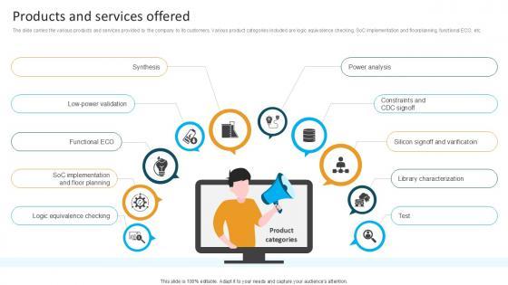 The slide carries the various products and services provided by the company to its customers. Various product categories included are logic equivalence checking, SoC implementation and floorplanning, functional ECO, etc. Formulating a presentation can take up a lot of effort and time, so the content and message should always be the primary focus. The visuals of the PowerPoint can enhance the presenters message, so our Products And Services Offered Computational Software Company Investor Funding Ppt Template was created to help save time. Instead of worrying about the design, the presenter can concentrate on the message while our designers work on creating the ideal templates for whatever situation is needed. Slidegeeks has experts for everything from amazing designs to valuable content, we have put everything into Products And Services Offered Computational Software Company Investor Funding Ppt Template The slide carries the various products and services provided by the company to its customers. Various product categories included are logic equivalence checking, SoC implementation and floorplanning, functional ECO, etc.