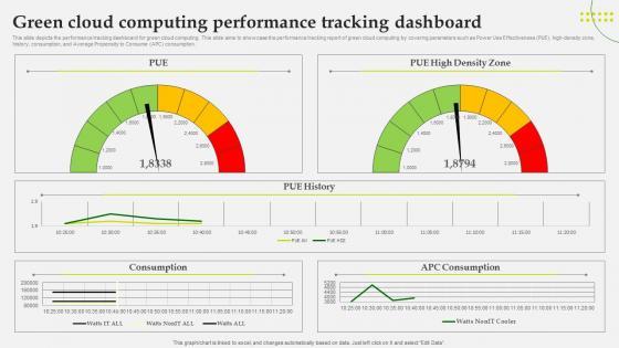This slide depicts the performance tracking dashboard for green cloud computing. This slide aims to showcase the performance tracking report of green cloud computing by covering parameters such as Power Use Effectiveness PUE, high-density zone, history, consumption, and Average Propensity to Consume APC consumption. The Sustainable Green Cloud Computing Performance Tracking Dashboard is a compilation of the most recent design trends as a series of slides. It is suitable for any subject or industry presentation, containing attractive visuals and photo spots for businesses to clearly express their messages. This template contains a variety of slides for the user to input data, such as structures to contrast two elements, bullet points, and slides for written information. Slidegeeks is prepared to create an impression. This slide depicts the performance tracking dashboard for green cloud computing. This slide aims to showcase the performance tracking report of green cloud computing by covering parameters such as Power Use Effectiveness PUE, high-density zone, history, consumption, and Average Propensity to Consume APC consumption.