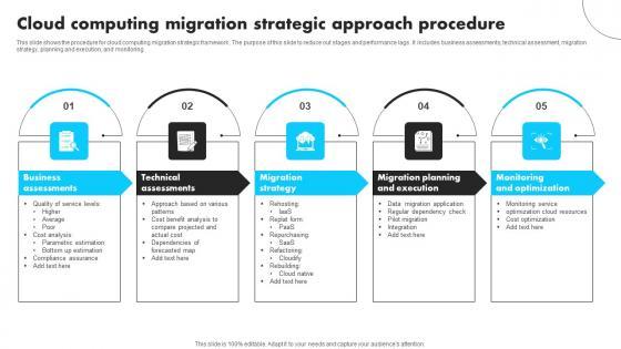 This slide shows the procedure for cloud computing migration strategic framework. The purpose of this slide to reduce out stages and performance lags . It includes business assessments, technical assessment, migration strategy, planning and execution, and monitoring. Showcasing this set of slides titled Cloud Computing Migration Strategic Approach Procedure Brochure Pdf The topics addressed in these templates are Business Assessments, Technical Assessments, Migration Strategy All the content presented in this PPT design is completely editable. Download it and make adjustments in color, background, font etc. as per your unique business setting. This slide shows the procedure for cloud computing migration strategic framework. The purpose of this slide to reduce out stages and performance lags . It includes business assessments, technical assessment, migration strategy, planning and execution, and monitoring.