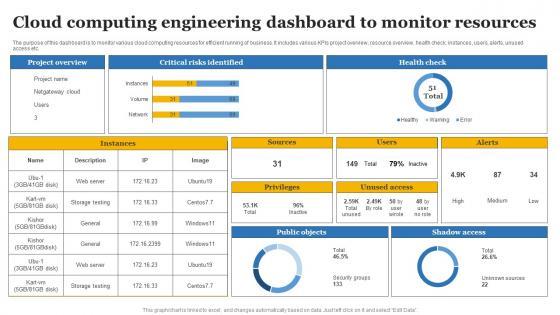 The purpose of this dashboard is to monitor various cloud computing resources for efficient running of business. It includes various KPIs project overview, resource overview, health check, instances, users, alerts, unused access etc. Pitch your topic with ease and precision using this Cloud Computing Engineering Dashboard To Monitor Resources Rules Pdf This layout presents information on Project Overview, Critical Risks Identified, Health Check It is also available for immediate download and adjustment. So, changes can be made in the color, design, graphics or any other component to create a unique layout. The purpose of this dashboard is to monitor various cloud computing resources for efficient running of business. It includes various KPIs project overview, resource overview, health check, instances, users, alerts, unused access etc.