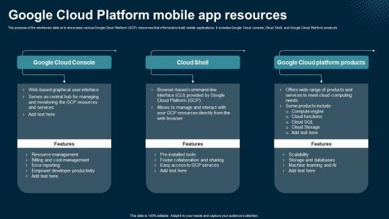 The purpose of the mentioned slide is to showcase various Google Cloud Platform GCP resources that offer tools to build mobile applications. It includes Google Cloud console, Cloud Shell, and Google Cloud Platform products . Are you in need of a template that can accommodate all of your creative concepts This one is crafted professionally and can be altered to fit any style. Use it with Google Slides or PowerPoint. Include striking photographs, symbols, depictions, and other visuals. Fill, move around, or remove text boxes as desired. Test out color palettes and font mixtures. Edit and save your work, or work with colleagues. Download Google Cloud Platform Mobile App Resources Application Areas Of Mobile Cloud Computing and observe how to make your presentation outstanding. Give an impeccable presentation to your group and make your presentation unforgettable. The purpose of the mentioned slide is to showcase various Google Cloud Platform GCP resources that offer tools to build mobile applications. It includes Google Cloud console, Cloud Shell, and Google Cloud Platform products