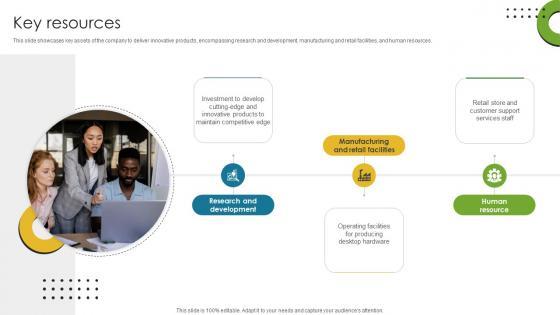 This slide showcases key assets of the company to deliver innovative products, encompassing research and development, manufacturing and retail facilities, and human resources. Slidegeeks is here to make your presentations a breeze with Key Resources Direct To Consumer Computer Manufacturing Business Model BMC SS V With our easy-to-use and customizable templates, you can focus on delivering your ideas rather than worrying about formatting. With a variety of designs to choose from, you are sure to find one that suits your needs. And with animations and unique photos, illustrations, and fonts, you can make your presentation pop. So whether you are giving a sales pitch or presenting to the board, make sure to check out Slidegeeks first This slide showcases key assets of the company to deliver innovative products, encompassing research and development, manufacturing and retail facilities, and human resources.