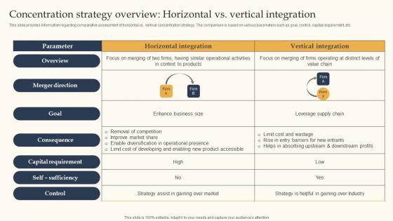 This slide provides information regarding comparative assessment of horizontal vs. vertical concentration strategy. The comparison is based on various parameters such as goal, control, capital requirement, etc. There are so many reasons you need a Concentration Strategy Overview Horizontal Vs Vertical Integration Topics PDF. The first reason is you can not spend time making everything from scratch, Thus, Slidegeeks has made presentation templates for you too. You can easily download these templates from our website easily.
