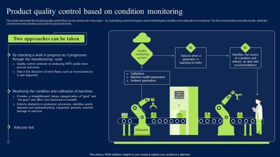 This slide represents the product quality control that can be carried out in two ways by inspecting a work in progress and monitoring the condition and calibration of machines. The first one provides accurate results, while the second one only provides good and not good outcomes. Slidegeeks has constructed Smart Manufacturing With Iot Product Quality Control Based On Condition Monitoring Graphics PDF after conducting extensive research and examination. These presentation templates are constantly being generated and modified based on user preferences and critiques from editors. Here, you will find the most attractive templates for a range of purposes while taking into account ratings and remarks from users regarding the content. This is an excellent jumping-off point to explore our content and will give new users an insight into our top-notch PowerPoint Templates.