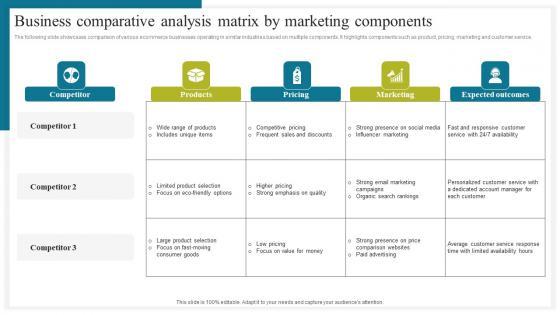 The following slide showcases comparison of various ecommerce businesses operating in similar industries based on multiple components. It highlights components such as product, pricing, marketing and customer service. Want to ace your presentation in front of a live audience Our Business Comparative Analysis How To Conduct Competitive Assessment Formats Pdf can help you do that by engaging all the users towards you. Slidegeeks experts have put their efforts and expertise into creating these impeccable powerpoint presentations so that you can communicate your ideas clearly. Moreover, all the templates are customizable, and easy to edit and downloadable. Use these for both personal and commercial use. The following slide showcases comparison of various ecommerce businesses operating in similar industries based on multiple components. It highlights components such as product, pricing, marketing and customer service.