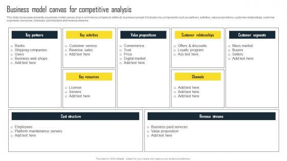 This slide showcases presents a business model canvas of an e-commerce company to define and business concept. It includes key components such as partners, activities, value propositions, customer relationships, customer segments, resources, channels, cost structure and revenue streams. Coming up with a presentation necessitates that the majority of the effort goes into the content and the message you intend to convey. The visuals of a PowerPoint presentation can only be effective if it supplements and supports the story that is being told. Keeping this in mind our experts created Steps To Conduct Competitor Analysis Business Model Canvas For Competitive Analysis Designs PDF to reduce the time that goes into designing the presentation. This way, you can concentrate on the message while our designers take care of providing you with the right template for the situation.