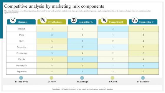 This slide showcases competitor analysis based on market mix elements which are product, price, place, promotion, positioning, people, partnership and reputation. Its purpose is to determine own business position against competitors. Boost your pitch with our creative Steps To Conduct Competitor Analysis Competitive Analysis By Marketing Mix Components Demonstration PDF. Deliver an awe-inspiring pitch that will mesmerize everyone. Using these presentation templates you will surely catch everyones attention. You can browse the ppts collection on our website. We have researchers who are experts at creating the right content for the templates. So you do not have to invest time in any additional work. Just grab the template now and use them.