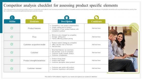 This slide presents a checklist presenting various components associated to rival business products to perform competitor analysis and develop marketing strategies. It highlights elements such as product features, pricing, free tier, customers, product strength weakness and customer reviews. If your project calls for a presentation, then Slidegeeks is your go to partner because we have professionally designed, easy to edit templates that are perfect for any presentation. After downloading, you can easily edit Competitor Analysis Checklist How To Conduct Competitive Assessment Structure Pdf and make the changes accordingly. You can rearrange slides or fill them with different images. Check out all the handy templates This slide presents a checklist presenting various components associated to rival business products to perform competitor analysis and develop marketing strategies. It highlights elements such as product features, pricing, free tier, customers, product strength weakness and customer reviews.
