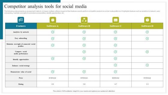 The following slide presents an assessment matrix to compare multiple software based on their features used to perform competitor analysis on social media platforms. It highlights features such as analytics by network, easy onboarding, maintain oversight of connected social profiles, identify opportunities, etc. Crafting an eye catching presentation has never been more straightforward. Let your presentation shine with this tasteful yet straightforward Competitor Analysis Tools For How To Conduct Competitive Assessment Icons Pdf template. It offers a minimalistic and classy look that is great for making a statement. The colors have been employed intelligently to add a bit of playfulness while still remaining professional. Construct the ideal Competitor Analysis Tools For How To Conduct Competitive Assessment Icons Pdf that effortlessly grabs the attention of your audience. Begin now and be certain to wow your customers. The following slide presents an assessment matrix to compare multiple software based on their features used to perform competitor analysis on social media platforms. It highlights features such as analytics by network, easy onboarding, maintain oversight of connected social profiles, identify opportunities, etc.