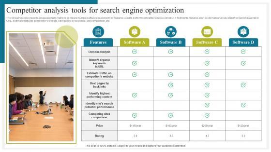 The following slide presents an assessment matrix to compare multiple software based on their features used to perform competitor analysis on SEO. It highlights features such as domain analysis, identify organic keywords in URL, estimate traffic on competitors website, best pages by backlinks, site comparison, etc. Formulating a presentation can take up a lot of effort and time, so the content and message should always be the primary focus. The visuals of the PowerPoint can enhance the presenters message, so our Competitor Analysis Tools How To Conduct Competitive Assessment Professional Pdf was created to help save time. Instead of worrying about the design, the presenter can concentrate on the message while our designers work on creating the ideal templates for whatever situation is needed. Slidegeeks has experts for everything from amazing designs to valuable content, we have put everything into Competitor Analysis Tools How To Conduct Competitive Assessment Professional Pdf The following slide presents an assessment matrix to compare multiple software based on their features used to perform competitor analysis on SEO. It highlights features such as domain analysis, identify organic keywords in URL, estimate traffic on competitors website, best pages by backlinks, site comparison, etc.