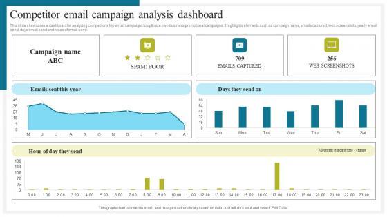 This slide showcases a dashboard for analyzing competitors top email campaigns to optimize own business promotional campaigns. It highlights elements such as campaign name, emails captured, web screenshots, yearly email send, days email send and hours of email send. Welcome to our selection of the Competitor Email Campaign Analysis How To Conduct Competitive Assessment Structure Pdf. These are designed to help you showcase your creativity and bring your sphere to life. Planning and Innovation are essential for any business that is just starting out. This collection contains the designs that you need for your everyday presentations. All of our PowerPoints are 100 percent editable, so you can customize them to suit your needs. This multi purpose template can be used in various situations. Grab these presentation templates today. This slide showcases a dashboard for analyzing competitors top email campaigns to optimize own business promotional campaigns. It highlights elements such as campaign name, emails captured, web screenshots, yearly email send, days email send and hours of email send.