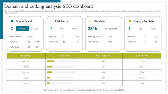 This slide showcases a SEO dashboard for analyzing competitors domain and monitor changes in ranking. It highlights elements such as organic search, paid search, backlinks, display advertising, organic keywords and main organic competitors. Retrieve professionally designed Domain And Ranking Analysis How To Conduct Competitive Assessment Template Pdf to effectively convey your message and captivate your listeners. Save time by selecting pre made slideshows that are appropriate for various topics, from business to educational purposes. These themes come in many different styles, from creative to corporate, and all of them are easily adjustable and can be edited quickly. Access them as PowerPoint templates or as Google Slides themes. You do not have to go on a hunt for the perfect presentation because Slidegeeks got you covered from everywhere. This slide showcases a SEO dashboard for analyzing competitors domain and monitor changes in ranking. It highlights elements such as organic search, paid search, backlinks, display advertising, organic keywords and main organic competitors.