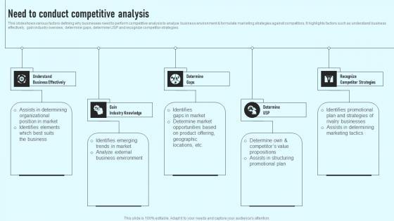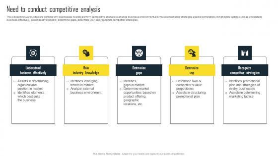 This slideshows various factors defining why businesses need to perform competitive analysis to analyze business environment and formulate marketing strategies against competitors. It highlights factors such as understand business effectively, gain industry overview, determine gaps, determine USP and recognize competitor strategies. Slidegeeks is here to make your presentations a breeze with Steps To Conduct Competitor Analysis Need To Conduct Competitive Analysis Professional PDF With our easy-to-use and customizable templates, you can focus on delivering your ideas rather than worrying about formatting. With a variety of designs to choose from, you are sure to find one that suits your needs. And with animations and unique photos, illustrations, and fonts, you can make your presentation pop. So whether you are giving a sales pitch or presenting to the board, make sure to check out Slidegeeks first