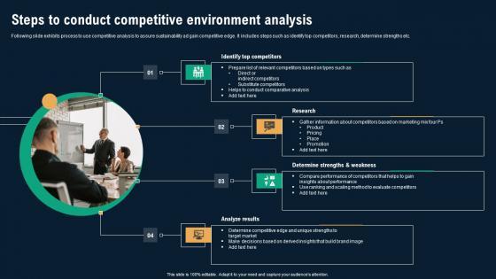 Following slide exhibits process to use competitive analysis to assure sustainability ad gain competitive edge. It includes steps such as identify top competitors, research, determine strengths etc. Are you in need of a template that can accommodate all of your creative concepts This one is crafted professionally and can be altered to fit any style. Use it with Google Slides or PowerPoint. Include striking photographs, symbols, depictions, and other visuals. Fill, move around, or remove text boxes as desired. Test out color palettes and font mixtures. Edit and save your work, or work with colleagues. Download Steps To Conduct Competitive Environment Analysis Information PDF and observe how to make your presentation outstanding. Give an impeccable presentation to your group and make your presentation unforgettable.