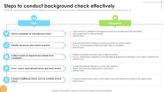 This slide show steps to perform background check of candidate for job requirements. It include steps such as inform candidate, identify necessary documents required and cross-check employment history, etc. Formulating a presentation can take up a lot of effort and time, so the content and message should always be the primary focus. The visuals of the PowerPoint can enhance the presenters message, so our Steps To Conduct Background Employee Attraction And Competency Ppt Powerpoint was created to help save time. Instead of worrying about the design, the presenter can concentrate on the message while our designers work on creating the ideal templates for whatever situation is needed. Slidegeeks has experts for everything from amazing designs to valuable content, we have put everything into Steps To Conduct Background Employee Attraction And Competency Ppt Powerpoint This slide show steps to perform background check of candidate for job requirements. It include steps such as inform candidate, identify necessary documents required and cross-check employment history, etc.