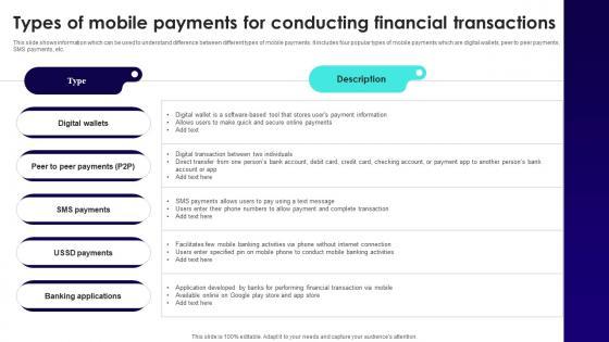 This slide shows information which can be used to understand difference between different types of mobile payments. It includes four popular types of mobile payments which are digital wallets, peer to peer payments, SMS payments, etc. Slidegeeks has constructed Wireless Banking To Improve Types Of Mobile Payments For Conducting Financial Fin SS V after conducting extensive research and examination. These presentation templates are constantly being generated and modified based on user preferences and critiques from editors. Here, you will find the most attractive templates for a range of purposes while taking into account ratings and remarks from users regarding the content. This is an excellent jumping-off point to explore our content and will give new users an insight into our top-notch PowerPoint Templates. This slide shows information which can be used to understand difference between different types of mobile payments. It includes four popular types of mobile payments which are digital wallets, peer to peer payments, SMS payments, etc.