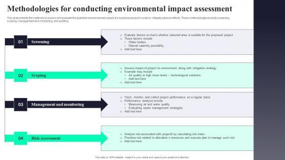 This slide exhibits the methods to access and evaluate the potential environmental impact of a business project in order to mitigate adverse effects. These methodologies include screening, scoping, management and monitoring, and auditing. Showcasing this set of slides titled Methodologies For Conducting Environmental Impact Assessment Infographics Pdf. The topics addressed in these templates are Screening, Scoping, Management And Monitoring. All the content presented in this PPT design is completely editable. Download it and make adjustments in color, background, font etc. as per your unique business setting. This slide exhibits the methods to access and evaluate the potential environmental impact of a business project in order to mitigate adverse effects. These methodologies include screening, scoping, management and monitoring, and auditing.