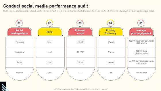 The following slide showcases social media audit report to determine best performing channel and streamline efforts to drive results. It includes elements such as follower count, posting frequency, average post engagement etc. Retrieve professionally designed Effective Real Time Marketing Principles Conduct Social Media Performance Audit Topics Pdf to effectively convey your message and captivate your listeners. Save time by selecting pre-made slideshows that are appropriate for various topics, from business to educational purposes. These themes come in many different styles, from creative to corporate, and all of them are easily adjustable and can be edited quickly. Access them as PowerPoint templates or as Google Slides themes. You do not have to go on a hunt for the perfect presentation because Slidegeeks got you covered from everywhere. The following slide showcases social media audit report to determine best performing channel and streamline efforts to drive results. It includes elements such as follower count, posting frequency, average post engagement etc.